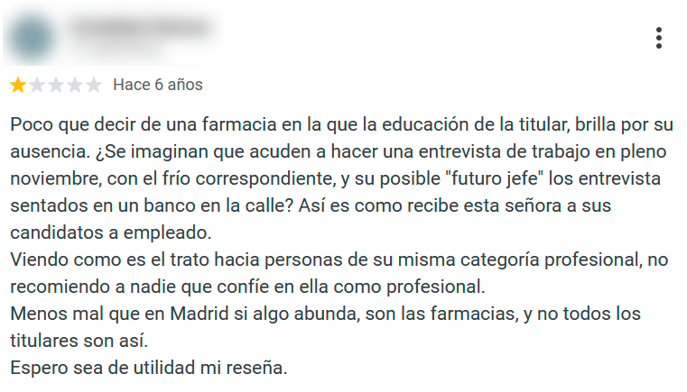 Cuando el candidato lee comentarios como este o similares, su interés por seguir adelante en el proceso de selección termina ahí mismo. No hablemos ya de si en la ficha de Google Business hay más de uno de este tipo.