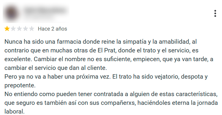 El daño reputacional es prácticamente irreversible. Hay farmacias que han cambiado de “marca” y han creado nueva web, ficha de Google, etc. para tratar de corregirlo, pero han fracasado porque no han corregido las causas subyacentes. En estos casos el problema real de la farmacia no es la falta de personal.